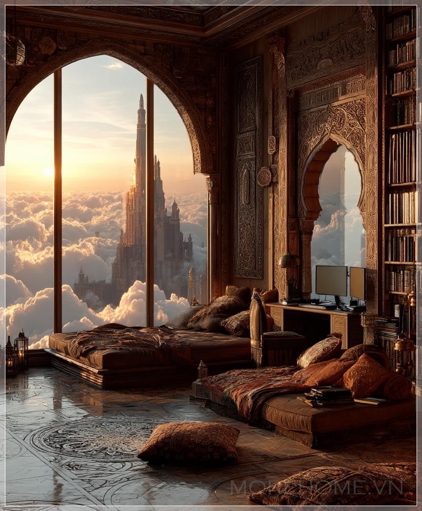 Trong không gian này, thời gian dường như ngừng trôi. Đây không chỉ là một phòng ngủ mà là một cõi mơ thu nhỏ, nơi quá khứ và tương lai, truyền thống và hiện đại, thực tế và tưởng tượng hòa quyện thành một bản giao hưởng tuyệt vời. Mỗi chi tiết, từ những đường chạm khắc tinh xảo đến ánh sáng hologram, từ hương thơm của sách cũ đến cảnh quan siêu thực bên ngoài, tất cả đều góp phần tạo nên một trải nghiệm không gian đa giác quan độc nhất.