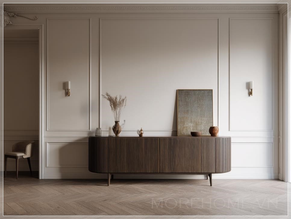 Khi bước chân vào một ngôi nhà theo phong cách tối giản cổ điển, điều đầu tiên thu hút ánh nhìn thường là chiếc tủ trang trí được đặt khéo léo tại lối vào. Không chỉ đơn thuần là một món đồ nội thất, chiếc sideboard này như một lời chào đầu tiên, thể hiện tính cách và gu thẩm mỹ của gia chủ thông qua từng đường nét tinh tế và sự sắp xếp có chủ ý.