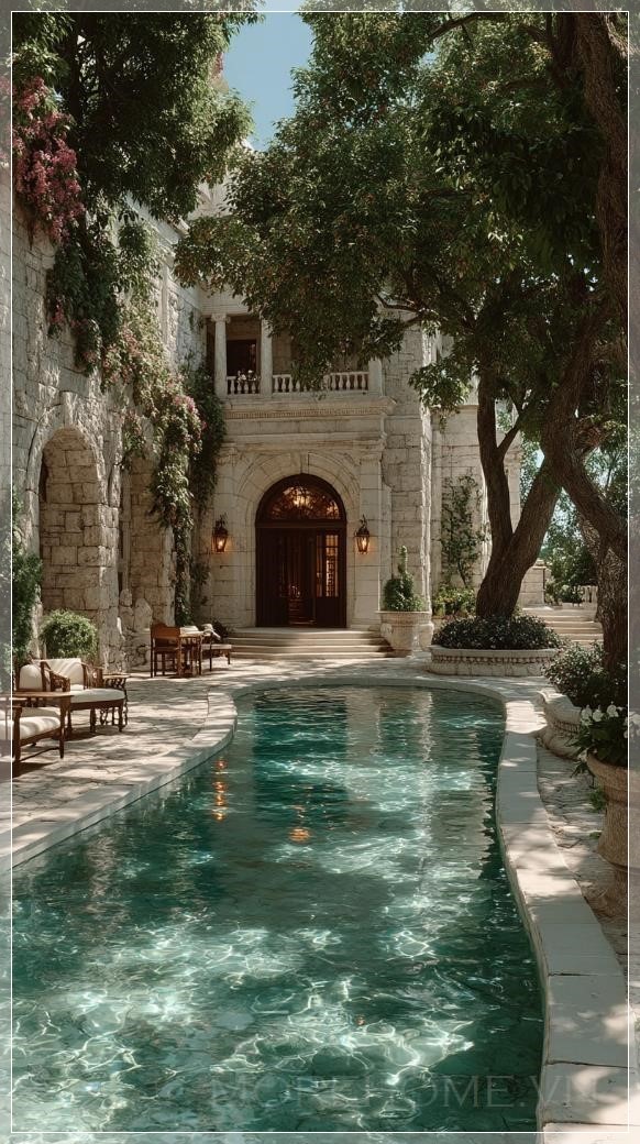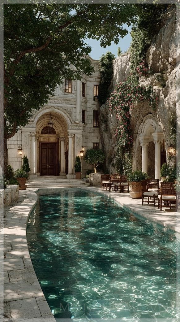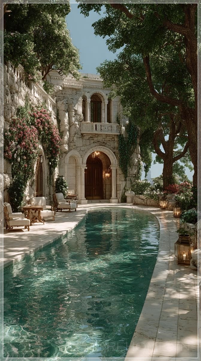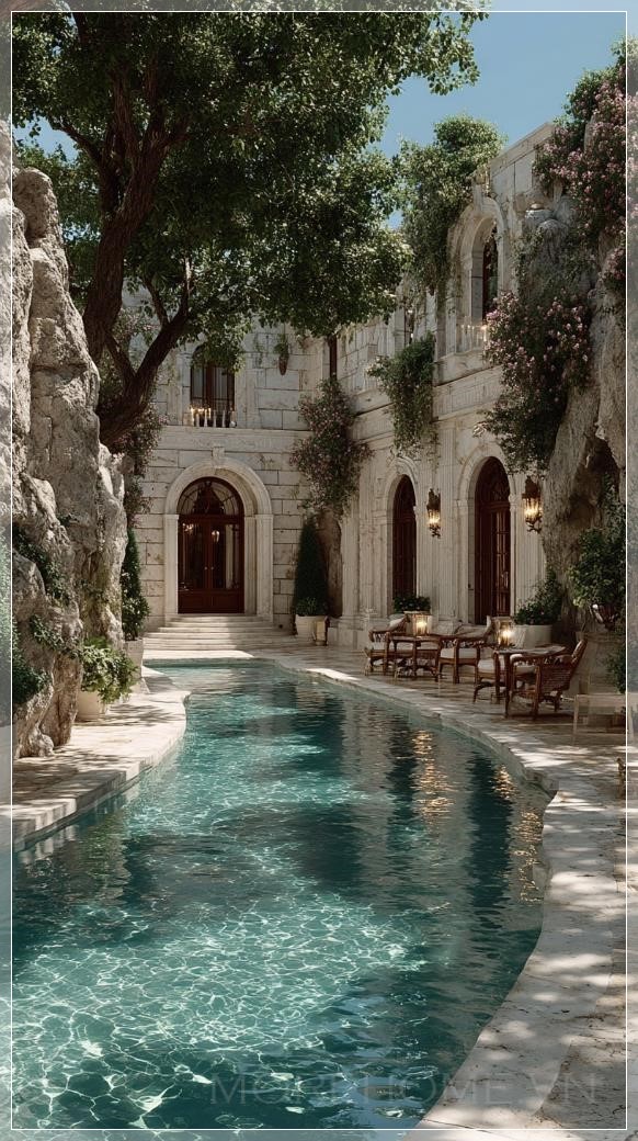 Khung cảnh xung quanh dinh thự được tô điểm bởi những cây hoa giấy rực rỡ, những chùm hoa tím hồng rơi rụng tự nhiên tạo nên những dải màu sống động trên nền đá trắng. Bên cạnh đó, những cây ô liu cổ thụ với tán lá xanh mướt đung đưa nhẹ nhàng trong gió chiều, tạo ra những bóng râm nhảy múa trên sàn đá cẩm thạch trắng muốt. Sự kết hợp giữa thiên nhiên và kiến trúc tạo nên một bức tranh hài hòa, nơi mỗi yếu tố đều góp phần làm nên vẻ đẹp tổng thể.