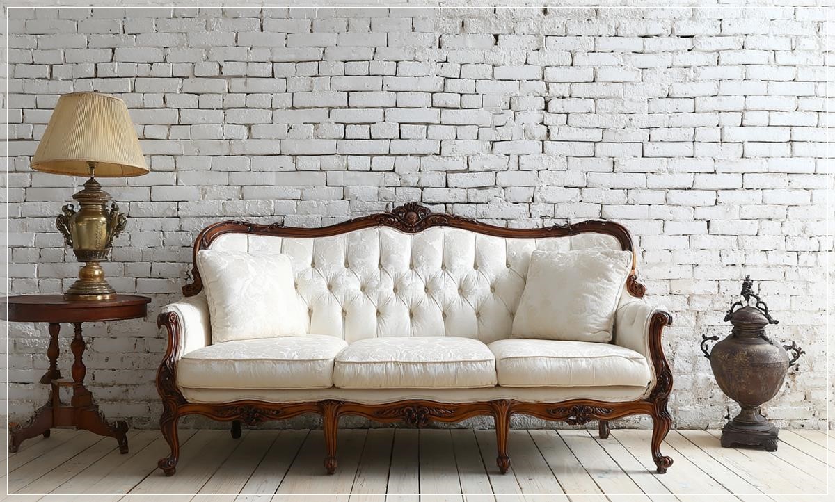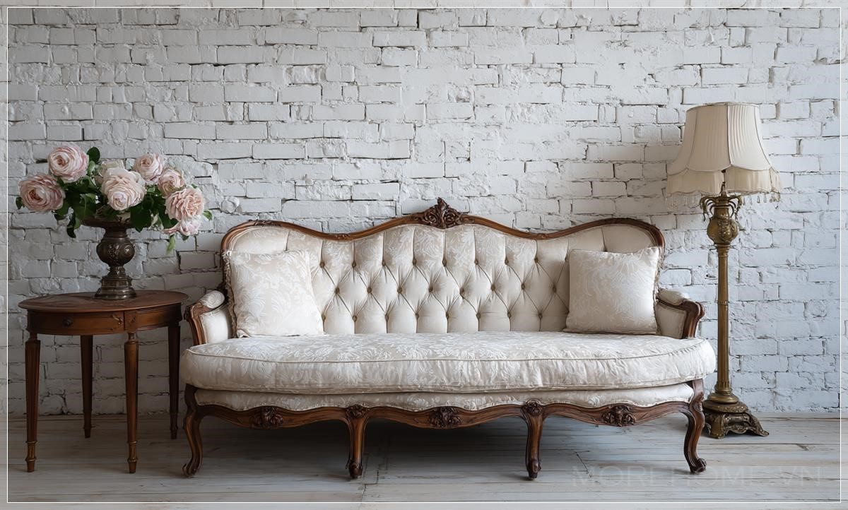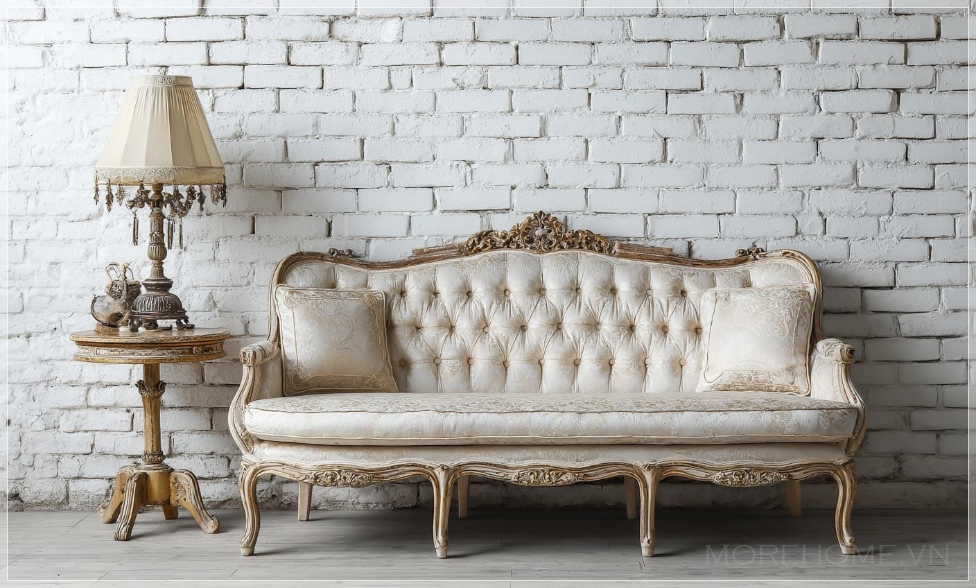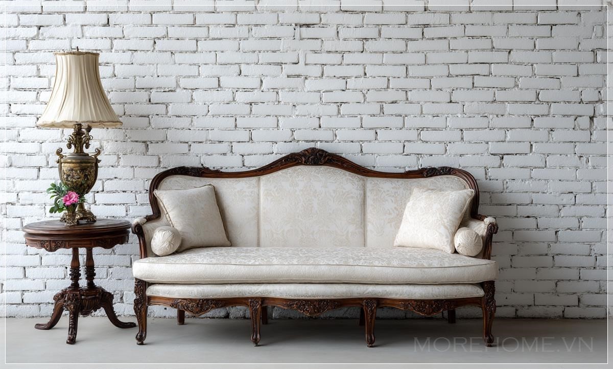 Trong không gian ngập tràn vẻ đẹp cổ điển, chiếc sofa vintage với vải bọc màu ngà và khung gỗ chạm trổ tinh xảo đứng tựa vào tường gạch trắng, mang đến một sự kết hợp hoàn hảo giữa sự sang trọng và lãng mạn. Được thiết kế tỉ mỉ với từng đường nét chạm khắc, khung gỗ của chiếc sofa như một tác phẩm nghệ thuật, tô điểm thêm cho không gian một vẻ đẹp tinh tế và vượt thời gian.