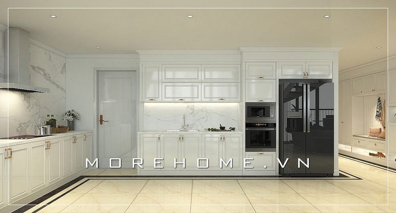 Không gian phòng bếp hiện đại với mẫu tủ bếp ốp màu trắng, mặt bếp đá solid surface màu trắng mang đến không gian nấu nướng tiện nghi cho người nội trợ