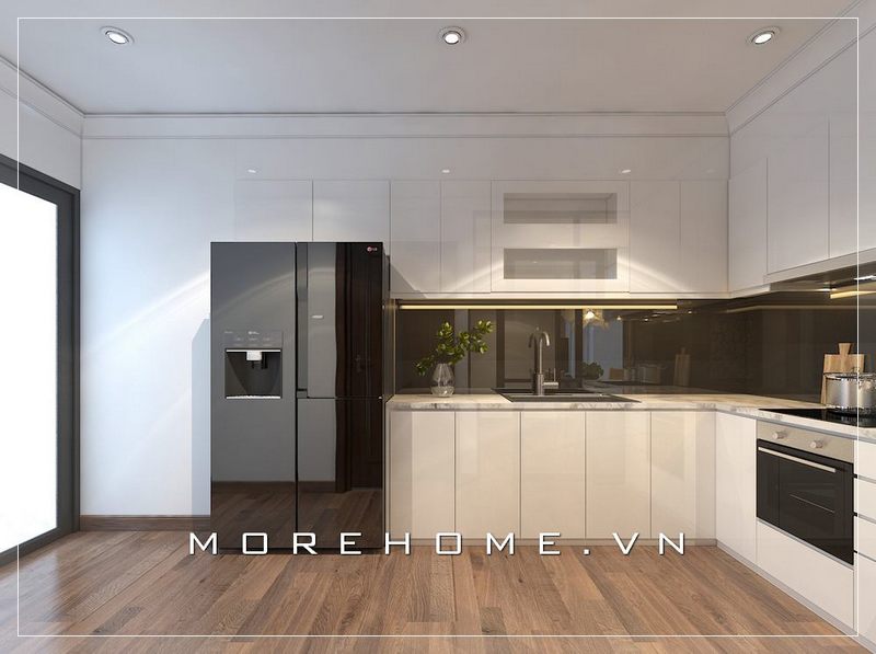 Mẫu tủ bếp gỗ acrylic màu trắng hiện đại, với thiết kế chữ L giúp căn bếp hiện nghi và sạch sẽ