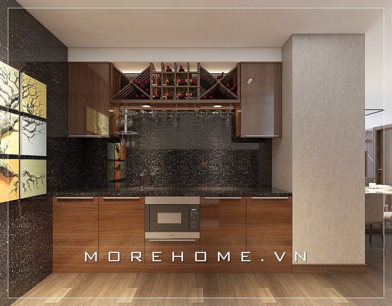 Mẫu tủ bếp gỗ công nghiệp có kiểu dáng hiện đại được sử dụng để thiết kế phòng bếp nhỏ.