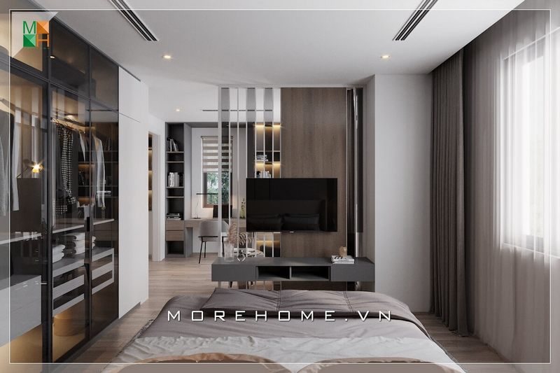 Mẫu phòng ngủ hiện đại trong các căn hộ sử dụng giường gỗ công nghiệp có độ đẹp và bền cao.