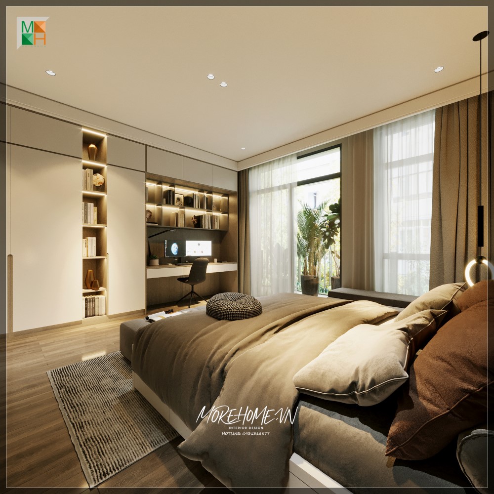 Bàn làm việc hiện đại được sắp xếp trong phòng ngủ sẽ giúp phân chia không gian theo sở thích cá nhân, tạo nên nét thẩm mỹ và cung cấp tiện nghi cho người sử dụng.