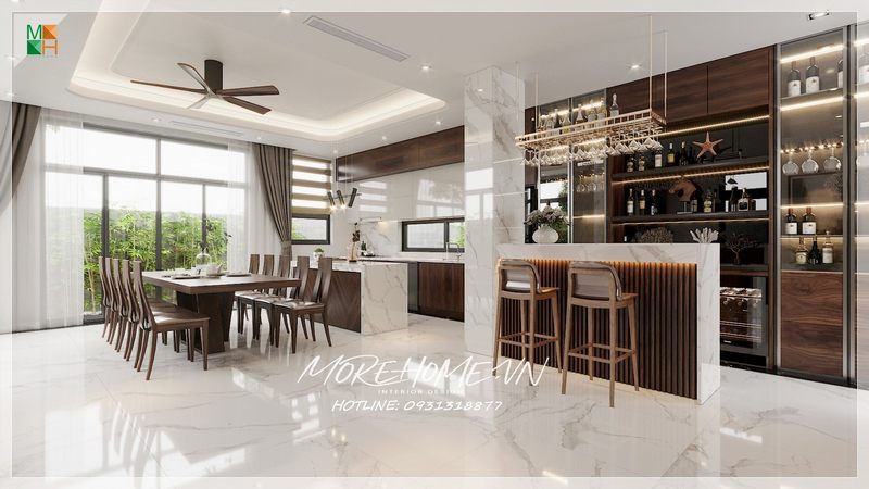 . Ý tưởng trang trí nội thất cho phòng bếp, ăn của biệt thự, nhà phố hiện đại là sự rộng rãi và đẳng cấp của người sở hữu được thể hiện qua các món đồ nội thất gỗ óc chó nâu cao cấp.