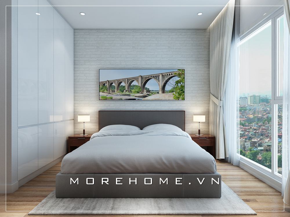 Trang trí nội thất phòng ngủ chung cư ấn tượng với giường ngủ gỗ công nghiệp màu trắng ấn tượng